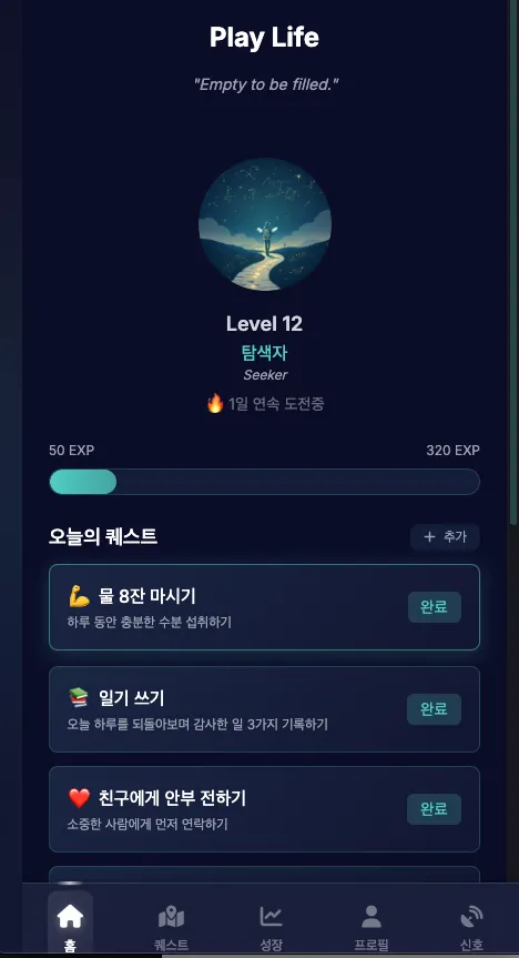 Play Life는 일상을 퀘스트로 만들고, 경험치를 쌓아 레벨업하는 철학적 라이프 앱입니다.