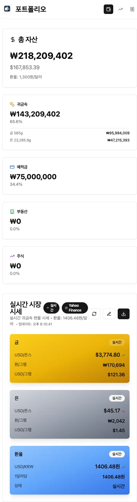 실시간 가치 추적: 금·은·환율·주식 시세 자동 반영
