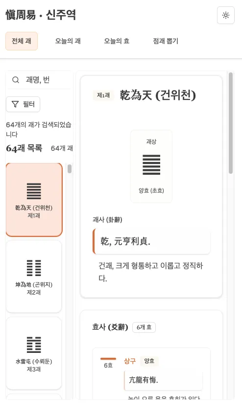 『신주역』 앱은 고대 『주역』의 지혜를 현대인의 삶 속에 되살린 철학적 도구이자 자기 성찰의 길잡이입니다.